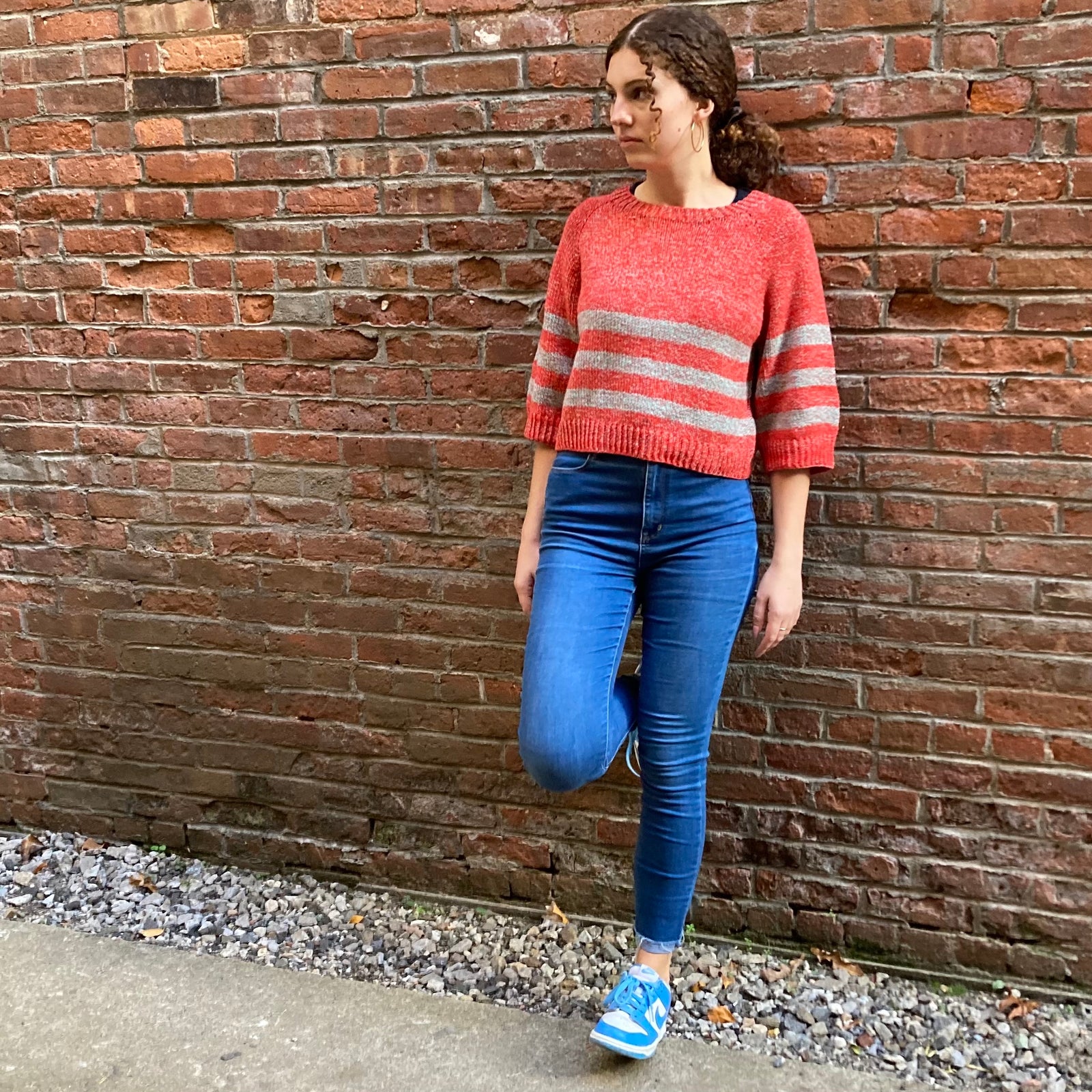 Peach Fuzz is knit top-down. It features a drop shoulder boat neck, color blocking and striped sleeves.